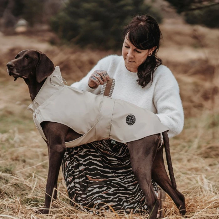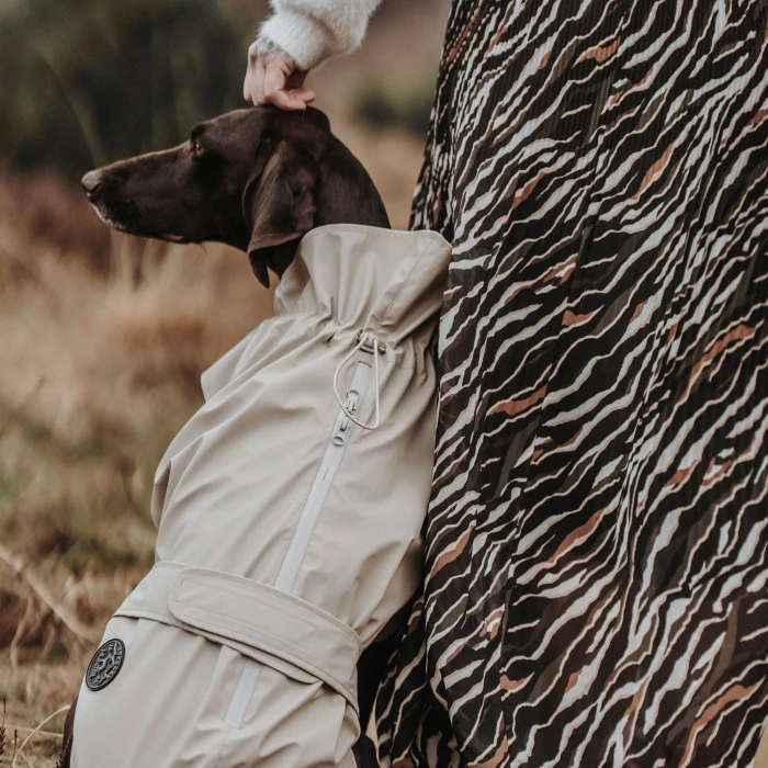 Kauluksessa on aukko hihnan kiinnitystä varten, mutta se toimii hyvin myös valjaiden kanssa vedenpitävän ja säädettävän kaksisuuntaisen vetoketjun ansiosta. Sadetakin vuori on valmistettu sileästä polyesterista, mikä tekee siitä mukavan käyttää riippumatta turkin laadusta ja pituudesta.