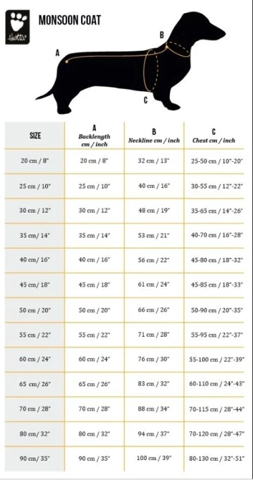 Suuret heijastavat printit takin takana ja 3M heijastimet selässä lisäävät turvallisuutta ja näkyvyyttä pimeässä. Monsoon-takin erinomainen muotoilu takaa hyvän istuvuuden useimmille roduille. Vatsakappaleen leveä muoto pitää takin paikoillaan ja se pysyy koiran päällä myös villimpien leikkien aikana ilman, että se rajoittaa koiran liikkeitä. Hyvin peittävä vatsakappale suojaa vatsaa tehokkaasti lialta ja hiekalta. Monsoon on valmistettu joustavasta ja äänettömästä kankaasta, se mukava käyttää ja nopea pukea.