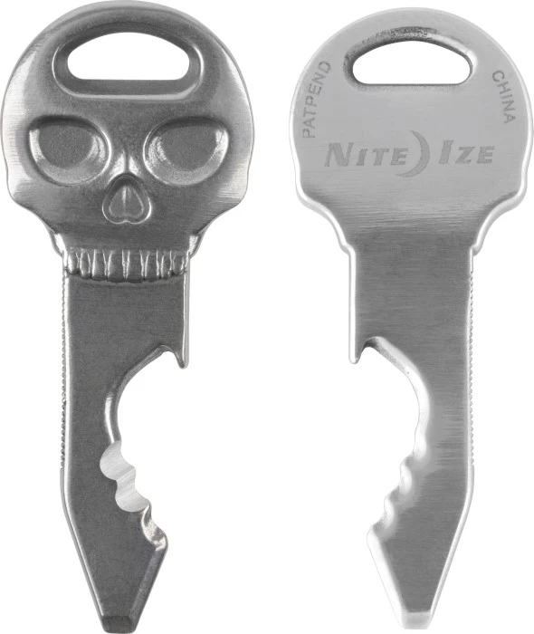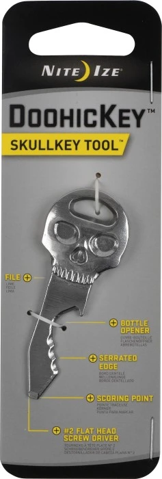 Nite Ize DoohicKey SkullKey Key Tool on pieni monitoimityökalu jonka voit kiinnittää avaimenperään. Valmistettu ruostumattomasta teräksestä. Voi käyttää ruuvimeisselinä, pullonavaajana, viilana tai leikkaamaan paperia, kartonkia tai muovia.