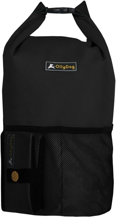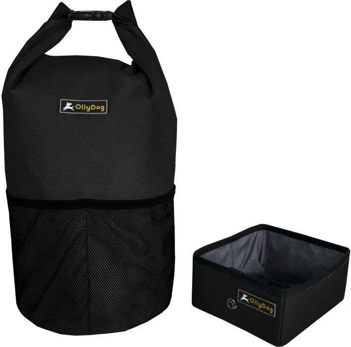 Kestävä koiran ruokapussi sekä kokoontaitettava ruokakuppi mukaan reissuun. Rullasuuaukko ja solki. Verkkotasku ulkopuolella. Valmistettu kierrätetyistä materiaaleista.