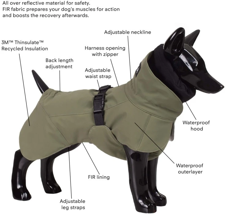 PAIKKA Visibility Winter Jacket -talvitakki yhdistää useat käytännölliset ominaisuudet ja se pitää koirasi lämpimänä ja kuivana sekä edistää lihasten palautumista. Takissa on tyylikäs ulkonäkö. Takki on valmistettu 100 % vedenpitävästä kankaasta, jossa on teipatut saumat ja älykäs kauttaaltaan heijastava pinta takaa todella hyvän näkyvyyden pimeän tullessa. Siinä on laadukas Thinsulate-vanu, joka lämmittää tehokkaasti. Tämä kevyt ja lämmin vanu on valmistettu 78 % kierrätetystä materiaalista.