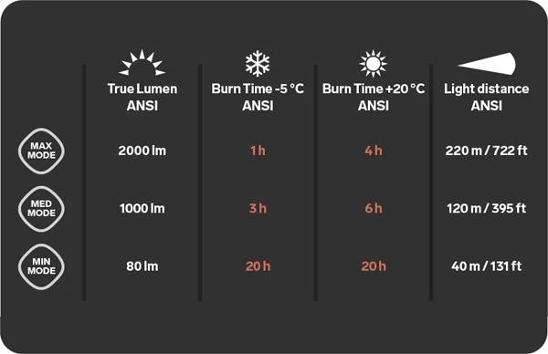 - Boost-tila (2300 lumenia) – Erittäin voimakas valo toimintoihin, jotka vaativat parempaa näkyvyyttä