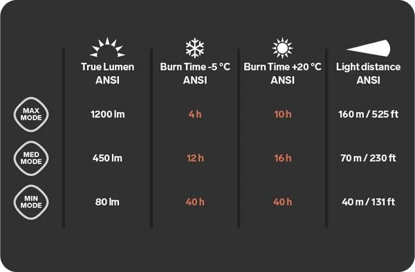 Trail Speed 5XT -otsalampussa on tehokas 7,0 Ah:n -akku, joka takaa valaisun pitkäaikaisenkin ulkoilun ajaksi. Akku kestää alimmalla teholla noin 40, keskiteholla noin 16 ja suurimmalla teholla noin 10 tuntia. Akussa oleva ilmaisin kertoo akun varaustilan. Varatila säätää valon automaattisesti ja takaa 30 minuutin valaisun. Lampussa on leveä hihna ja niskalevy, joiden ansiosta lamppu istuu päässä vakaasti ja mukavasti.
