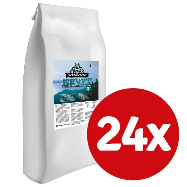Smurre Kevyt on korkealaatuinen, kuitupitoinen täysravinto, joka sopii erinomaisesti aktiivisten harrastus- ja työkoirien lepokauden ravinnoksi. Ruoan proteiininlähteenä toimii hyvin sulava, kuivattu kananliha sekä kuivattu kala ja hiilihydraatit koira saa ohrasta, riisistä ja maissista. Smurre Kevyt sisältää kaikki koiran tarvitsemat vitamiinit sekä ravinto- ja hivenaineet. Ruokaan on lisätty Omega-3 ja 6-rasvahappoja sekä C-vitamiinia. Lohiöljy parantaa koiran ihon, turkin ja polkuanturoiden kuntoa ja glukosamiini edesauttaa nivelten, luuston ja lihasten hyvinvointia. Smurre Kevyt ei sisällä vehnää tai keinotekoisia väri-, maku tai säilöntäaineita.